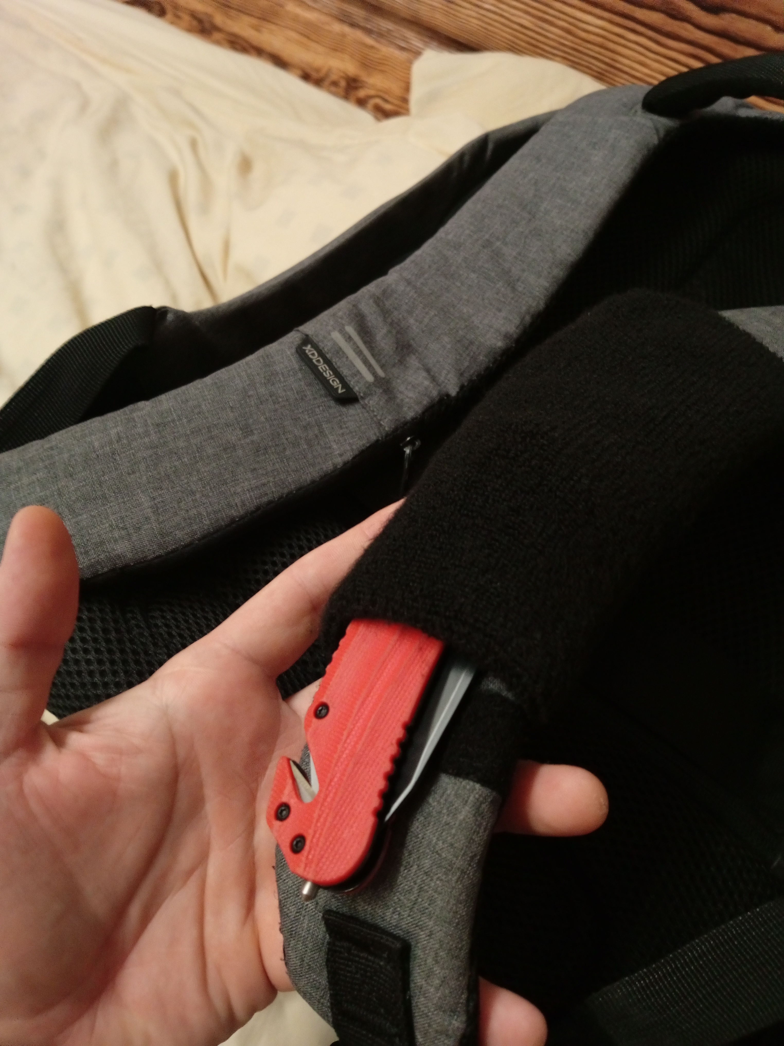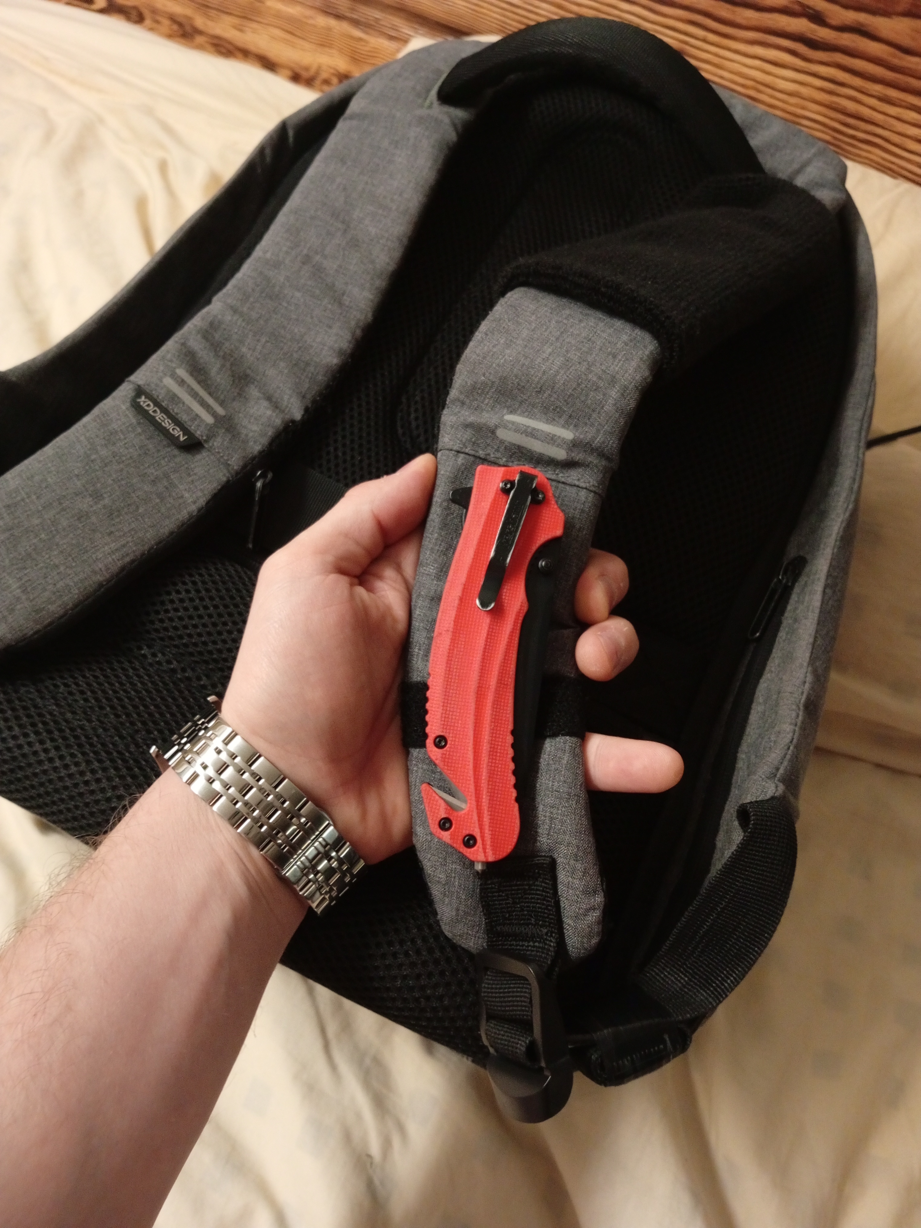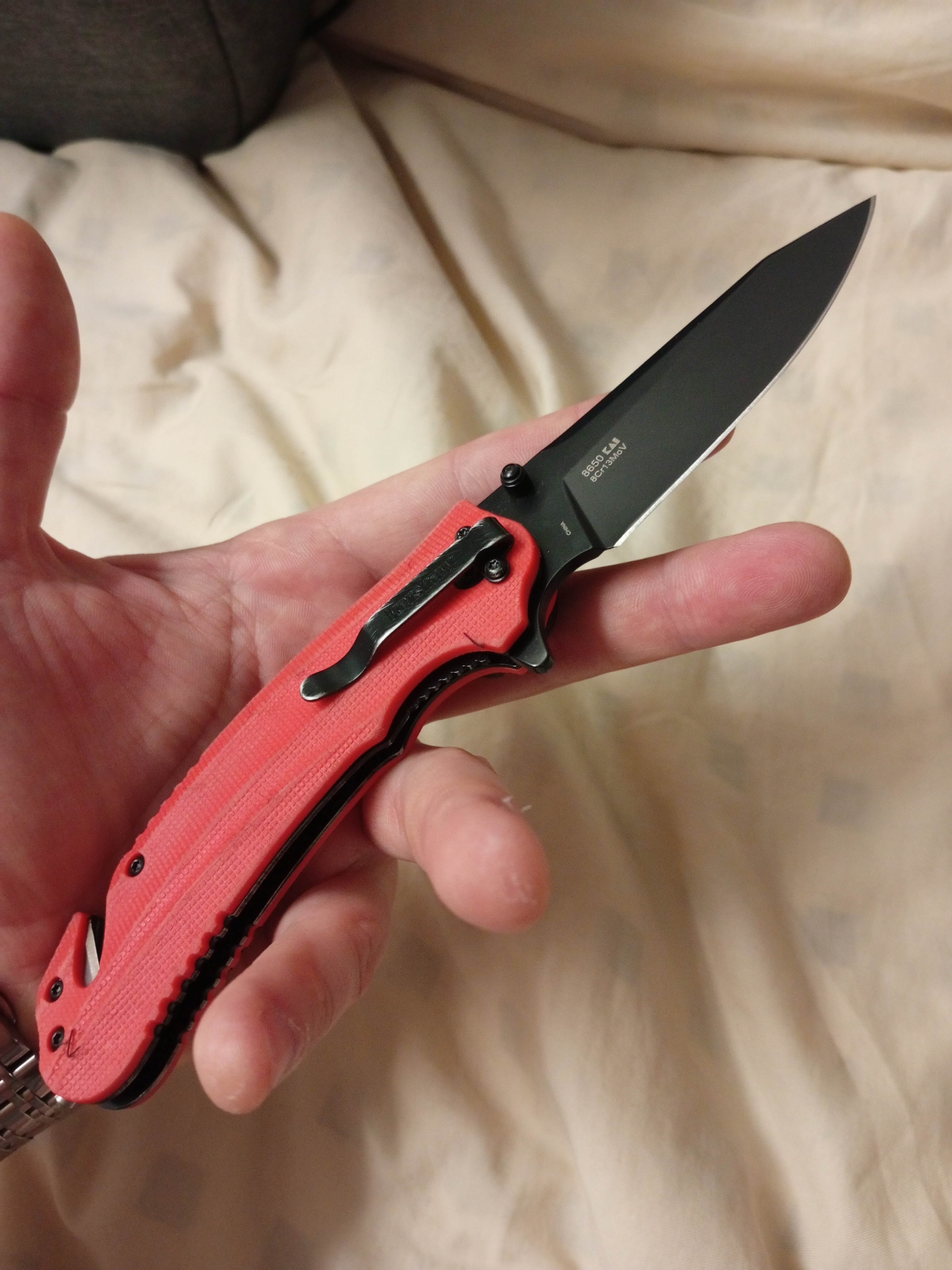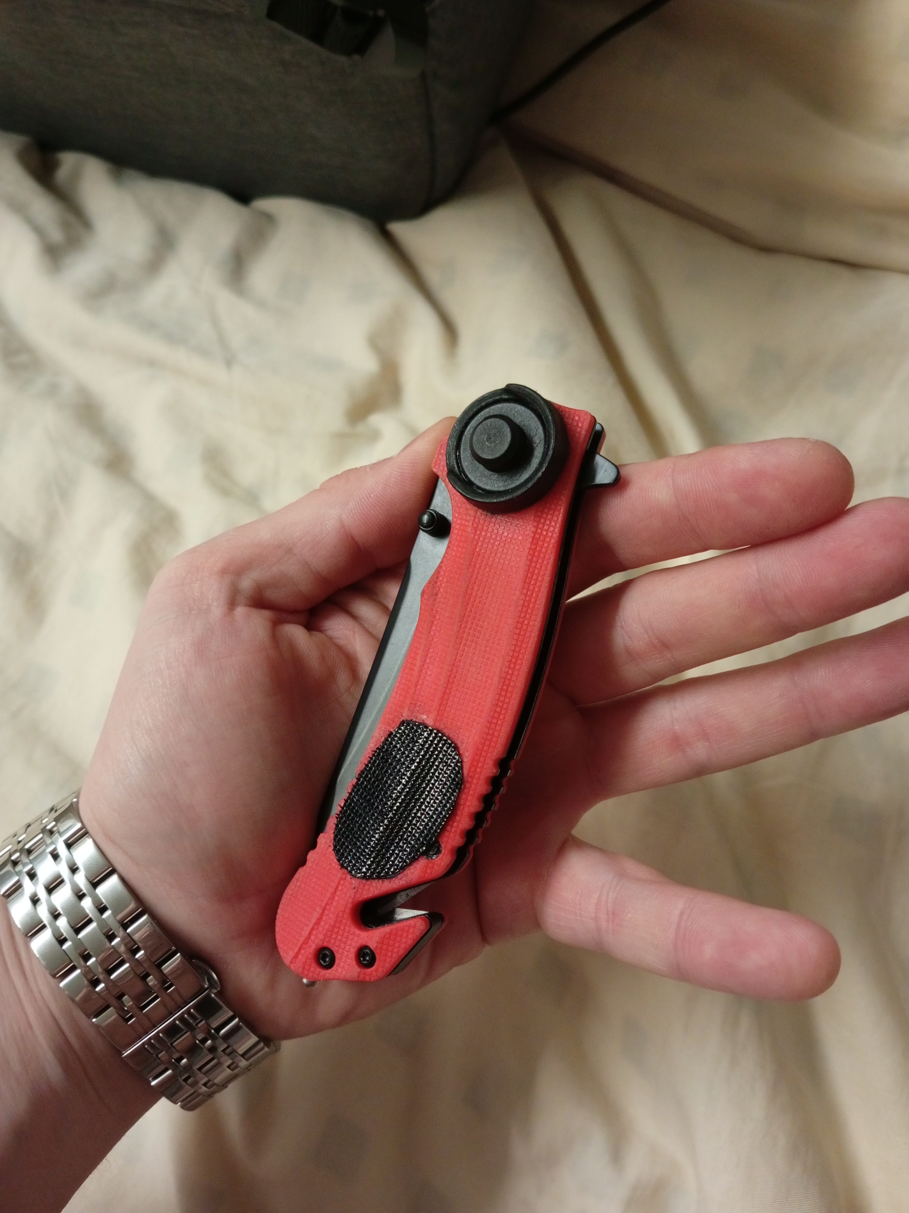Выбирал нож для постоянного ношения и использования на работе(стройка), в быту, природе, рыбалке и в лесу. Как раз искал яркий дизайн для заметности на случай утери. Подошёл идеально. Хват удобный, раскладывать за плавник очень удобно, пружина хорошая, раскрывает нож без осечек. А вот шпенёк на клинке маловат, палец так и хочет соскользнуть на клинок(((  Стеклобой работает, стекло бьёт, по твердости даже легко царапает стекло смартфона. Стропорез также рабочий, шнуры и веревки режет на раз, а вот  с ремнями или стропами нужно приловчиться. Доработал для удобства ношения на рюкзаке и сразу же убрал идеальность внешнего вида "состарив" шкуркой до состояния рабочего инструмента. Нож - это в первую очередь инструмент, а не сувенир)